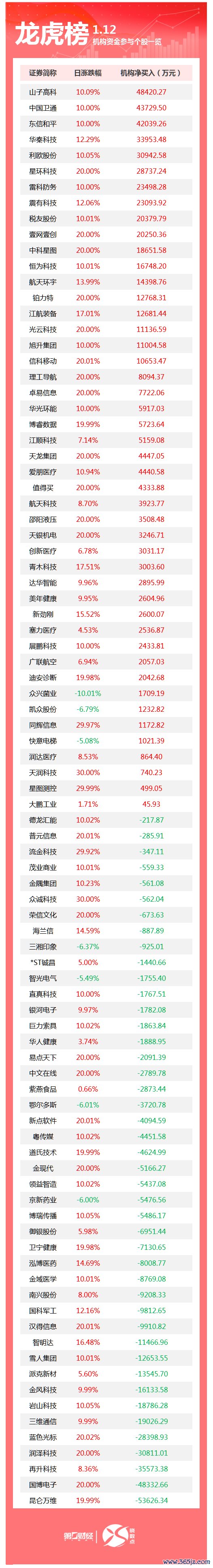 当天机构净买入前三的股票分别是山子高科、中国卫通、东信和平,净买入金额分别是4.84亿元、4.37亿元、4.2亿元。